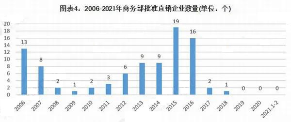 根據(jù)商務(wù)部直銷(xiāo)行業(yè)信息管理系統(tǒng)數(shù)據(jù)統(tǒng)計(jì)顯示,截至2021年2月23日,我國(guó)共有90家企業(yè)正式獲得直銷(xiāo)經(jīng)營(yíng)許可證,分布于19個(gè)省、自治區(qū)、直轄市,其中廣東、山東、北京等三個(gè)省市的企業(yè)居多,中西部地區(qū)的企業(yè)數(shù)量也在逐年上升!鞍偃招袆(dòng)”后,全國(guó)直銷(xiāo)企業(yè)數(shù)量下降至90家,2019年至今,商務(wù)部批準(zhǔn)直銷(xiāo)企業(yè)的數(shù)量為0個(gè)。