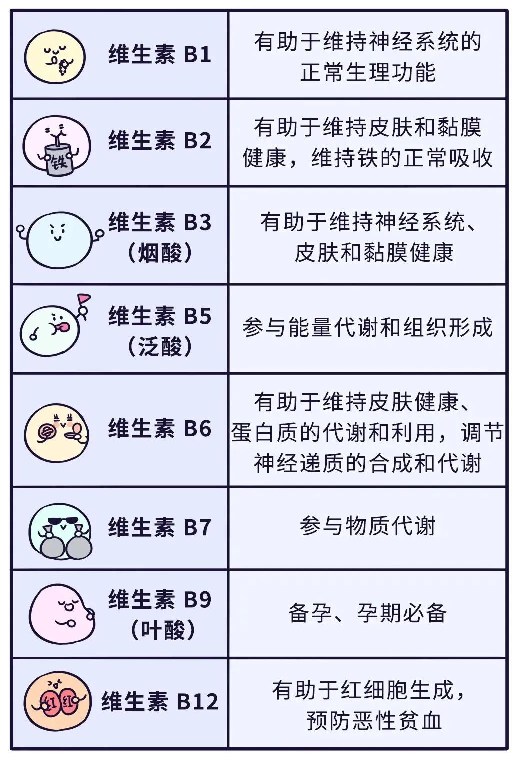 這個龐大的「家族」,包括維生素 B1、維生素 B2、維生素 B3,維生素 B5、維生素 B6、維生素 B7、維生素 B9、維生素 B12 八位成員,是維持人體健康、幫助預(yù)防疾病不可缺少的微量元素。